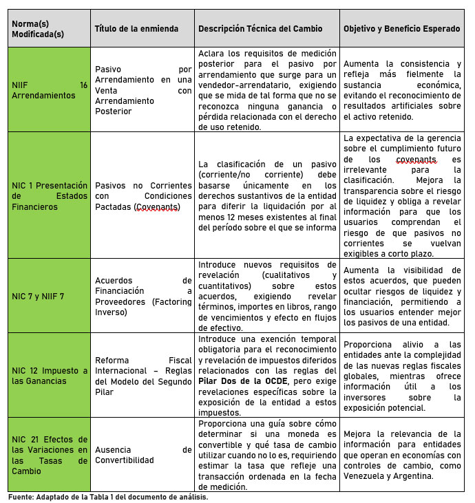 El proyecto de decreto de 2025 agrupa un conjunto de enmiendas de alcance limitado emitidas por el IASB entre septiembre de 2022 y septiembre de 2023.