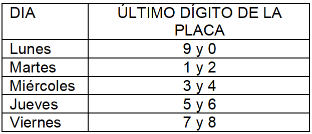 La restricción contenida en el presente artículo implica la prohibición de circulación de vehículos particulares en el perímetro urbano de Santiago de Cali de lunes a viernes dentro del periodo de tiempo comprendido entre las 06:00 hasta las 10:00 horas, y entre las 16:00 hasta las 20:00 horas del día, tomando como referencia el último dígito de la placa así: