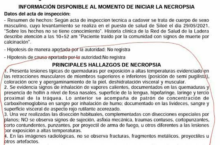 “Nos informa que el cadáver presenta quemaduras por exposición de altas temperaturas evidenciado en las retracciones musculares en miembros superiores e inferiores, e igualmente el dictamen señala que no se observan signos de sujeción, asfixia mecánica, traumas contusos, corto punzantes, corto contundentes, punzantes, por proyectil de arma de fuego u otros diferentes a las lesiones por exposición a altas temperaturas”, dijo Encinales.