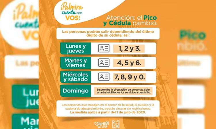 La Alcaldía de Palmira anunció un nuevo ‘Pico y Cédula’ que rige desde el primero de julio, con el fin de continuar con las medidas de restricción para evitar aglomeraciones y focos de propagación por la Covid-19.