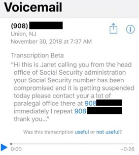 Imagen 2: Transcripción de un correo de voz alegando la suspensión del Número de Seguridad Social (SSN), identificador en Estados Unidos. Fuente: Twitter